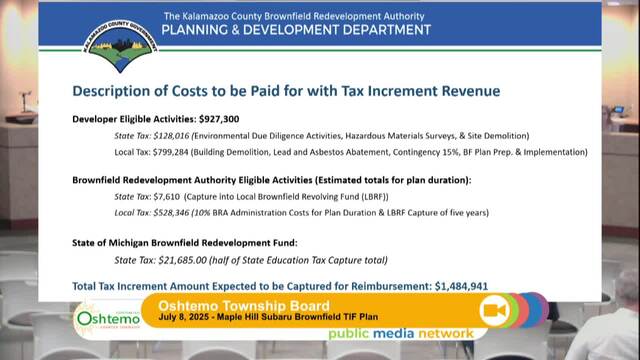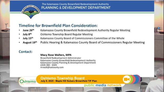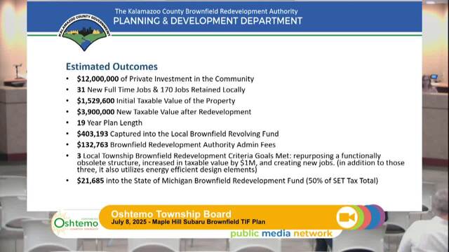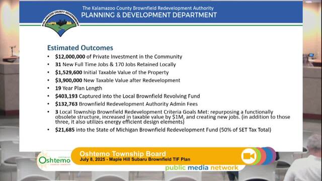 The Board reviews the installation of sewers and traffic calming measures in local neighborhoods. The board discusses infrastructure improvements and community benefits such as path extensions. Two key items include the approval of brownfield TIF plans for the Maple Hill Subaru development and the Westridge site condominium project, which aim to promote economic development and address housing needs. The meeting illustrates the township's commitment to community growth and sustainable development.