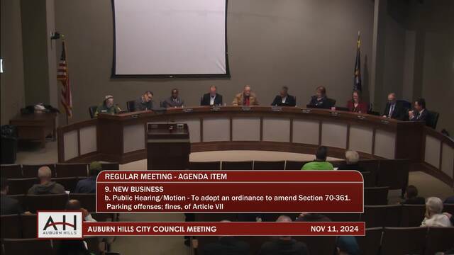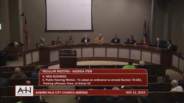 9. NEW BUSINESS 9a. Public Hearing/Motion – To adopt an Ordinance to amend Section 70-361. - Parking offenses; fines, of Article VII – Stopping, Standing, and Parking of Chapter 70- Traffic and Vehicles, of the Auburn Hills City Code on second reading.