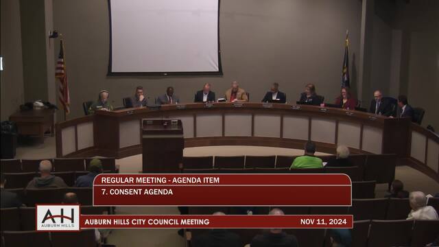 7. CONSENT AGENDA All items listed are considered to be routine by the City Council and will be enacted by one motion. There will be no separate discussion of these items unless a Council Member so requests, in which event the item will be removed from the Consent Agenda and considered in its normal sequence on the agenda. 7a. Board and Commission Minutes 7a1. Tax Increment Finance Authority, October 8, 2024 7a2. Brownfield Redevelopment Authority, October 15, 2024 7b. Motion – To approve the proclamation recognizing the dedicated service of Election Inspectors in Auburn Hills. 7c. Motion – To award the 1500 University Water Main Construction Contract. 7d. Motion – To approve the reallocation of remaining ARPA funds to support road infrastructure in 2024. 7e. Motion – To amend the General Fund Recreation Department Revenue and Expense for Tree Lighting Donation. 7f. Motion – To approve the CDBG Snow Service Contract.