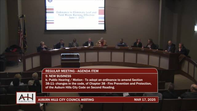 9b. Public Hearing/Motion – To adopt an ordinance to amend Section 38-11 - Changes in the code, of Chapter 38 – Fire Prevention and Protection, of the Auburn Hills City Code on Second Reading (Ordinance to Eliminate Leaf and Yard Waste Burning Effective June 1, 2025).