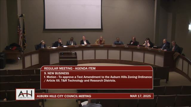 9f. Motion – To approve a Text Amendment to the Auburn Hills Zoning Ordinance / Article XII. T&R Technology and Research Districts.