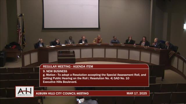 9g. Motion – To adopt a Resolution accepting the Special Assessment Roll and setting Public Hearing on the Roll (Resolution No. 4) SAD No. 10 Executive Hills Boulevard.