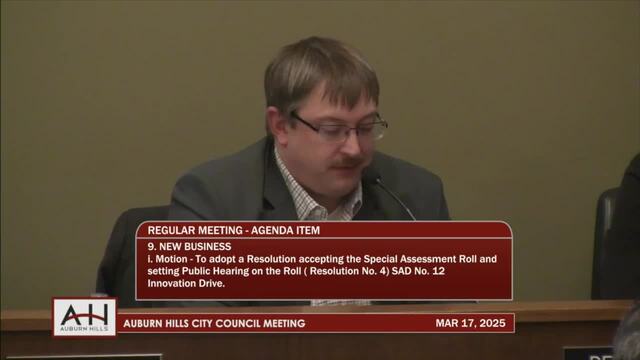 9i. Motion – To adopt a Resolution accepting the Special Assessment Roll and setting Public Hearing on the Roll (Resolution No. 4) SAD No. 12 Innovation Drive. 10. COMMENTS AND MOTIONS FROM COUNCIL 11. CITY ATTORNEY REPORT 12. CITY MANAGER REPORT 13. ADJOURNMENT