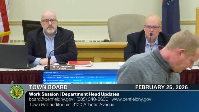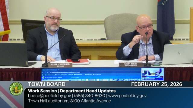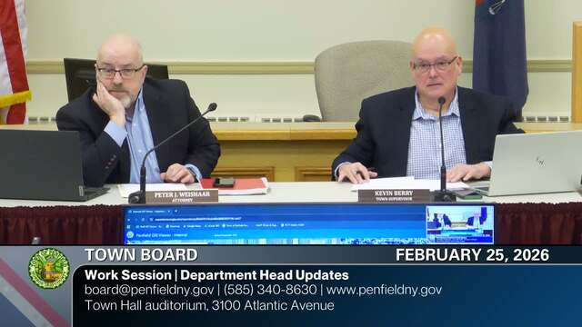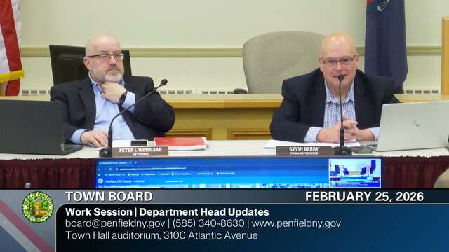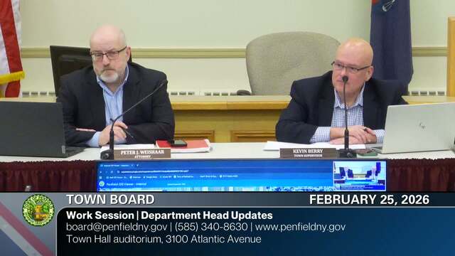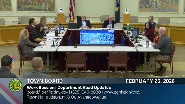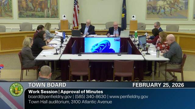 Meeting recordings of the Town of Penfield Town Board. For more information about the Town Board contact the Town Clerk at (585) 340-8629, clerk@penfield.org or Town Supervisor at (585) 340-8630, supervisor@penfield.org.